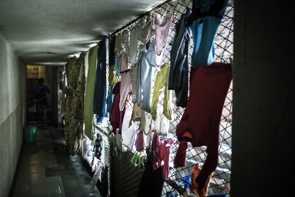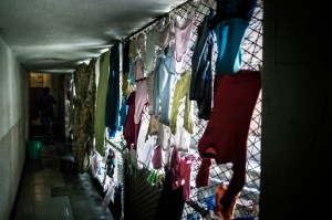 Washing hangs inside a corridor.